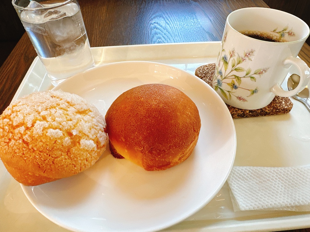 この日購入したのはメロンパンとクリームパン、飲み物はホットコーヒーを注文。メロンパンはサクサクフワフワ。噛むとサックリとした食感で美味しい!エアリーな感じであっという間に完食(笑)クリームパンは焼きたてという事で中身のカスタードクリームがまだ温かい!とろけるカスタードクリーム!そしてそれを包んでいる生地が凄く薄いのにもちっと感があり抜群の相性!温かい出来立てのクリームパン、最高でした!